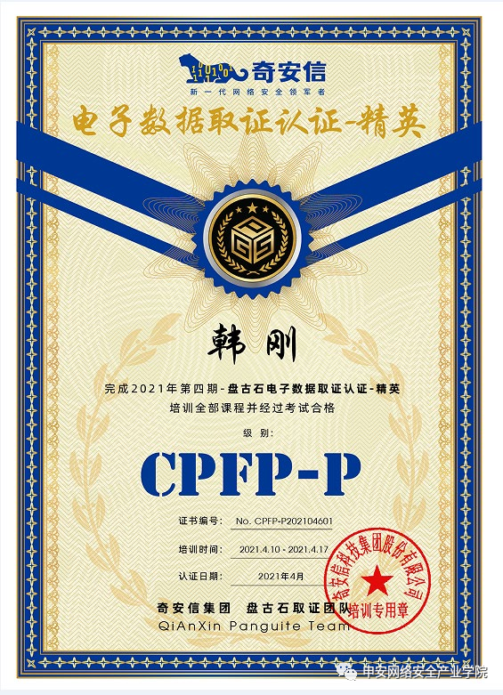 参加培训的人员,通过考核后获得由奇安信集团颁发的”盘古石电子数据取证认证”。样式: