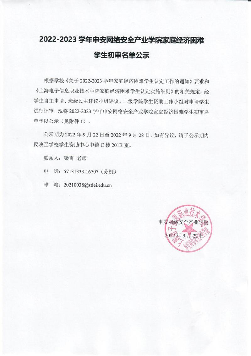 2022-2023学年申安网络安全产业学院家庭经济困难学生初审名单公示