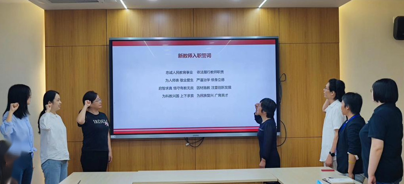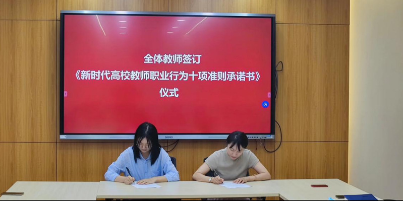 活动伊始,学院副院长陈真带领全体教师认真学习解读《新时代高校教师职业行为十项准则》,王樱老师作为领誓人带领全体新教师进行庄严宣誓。在学院副院长陈真的带领下,新教师分别签署了《新时代高校教师职业行为十项准则》承诺书。