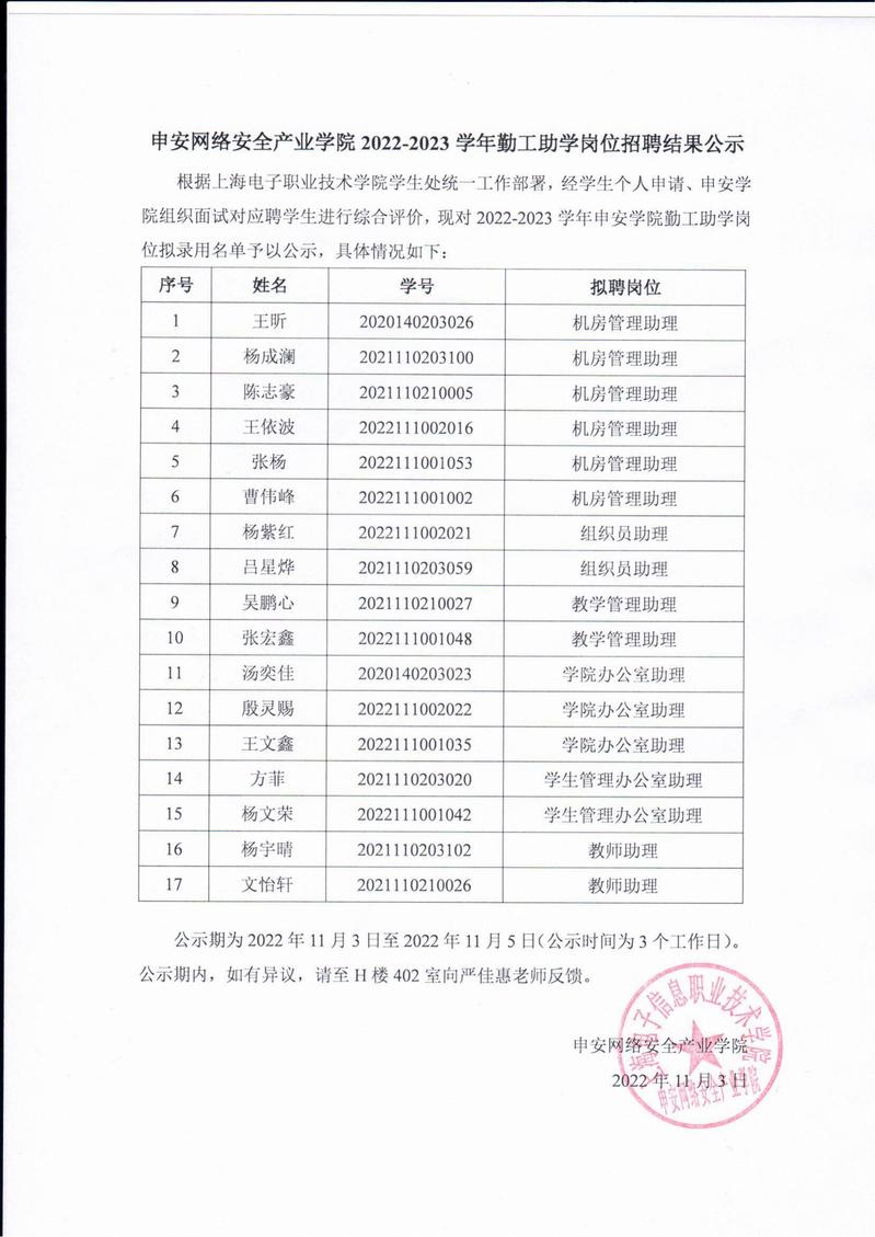 申安网络安全产业学院2022-2023学年勤工助学岗位招聘结果公示