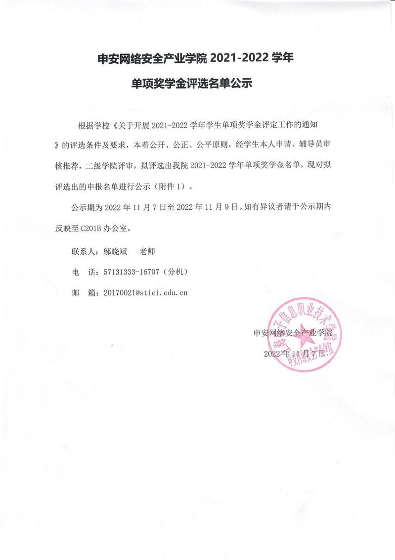 申安网络安全产业学院2021-2022学年单项奖学金评选名单公示