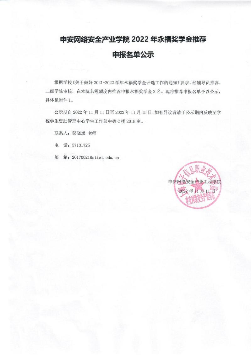 申安网络安全产业学院2022年永福奖学金推荐申报名单公示