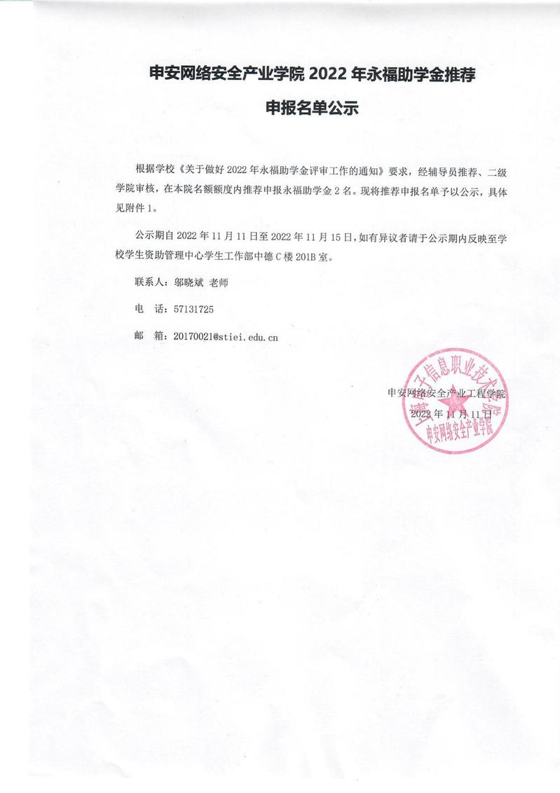 申安网络安全产业学院2022年永福助学金推荐申报名单公示