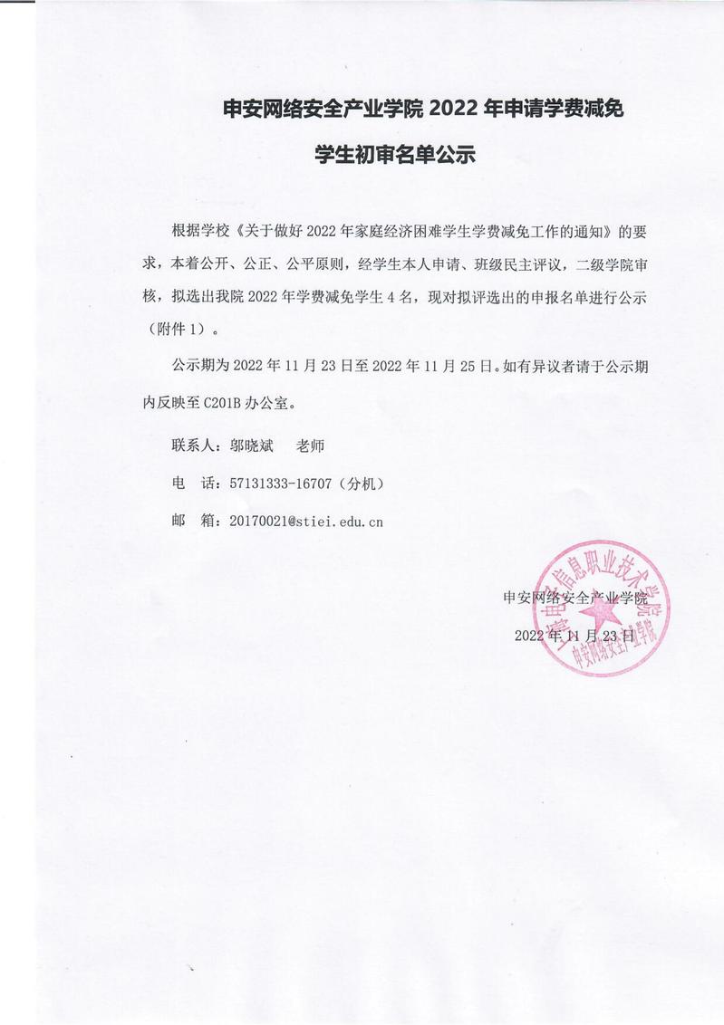 申安网络安全产业学院2022年申请学费减免学生初审名单公示