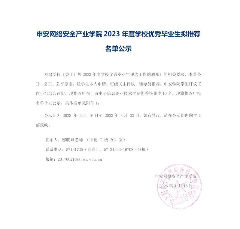 申安网络安全产业学院2023年度学校优秀毕业生拟推荐名单公示