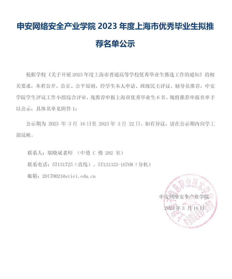 申安网络安全产业学院2023年度上海市优秀毕业生拟推荐名单公示