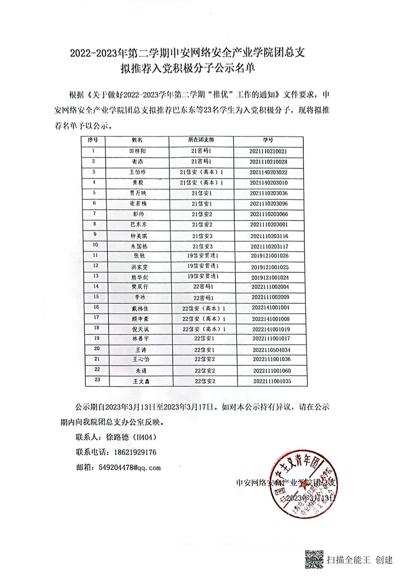 2022-2023学年第二学期申安网络安全产业学院团总支拟推荐入党积极分子名单公示