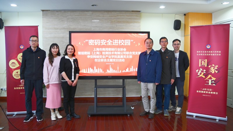 在今天的数字时代,几乎每个人在生活中都会使用各类的密码,像支付密码、银行卡密码等等,但是你知道吗?这些日常生活中常说的“密码”其实只是“口令”,并不是密码法中的“密码”。今年4月15日是第八个全民国家安全教育日,为深入学习总书记关于全面贯彻总体国家安全观、加快构建新安全格局的重要思想。为进一步拓宽密码安全教育阵地,引导广大青少年和在校学生掌握密码安全知识,增强密码安全意识,以党建引领激发党建活力,共同探索密码安全教育纳入国民教育体系的新模式。2023年4月19日下午,申安网络安全产业学院直属党支部与上海市商用密码行业协会、智巡密码(上海)检测技术有限公司联合党支部联合共同开展主题为“密码安全进校园”的党建活动。上海市商用密码行业协会副秘书长王明睿、智巡密码(上海)检测技术有限公司总经理、联合党支部书记郭筝博士,智巡密码(上海)检测技术有限公司技术专家韩玮博士,申安网络安全产业学院直属党支部书记、院长何永艳,申安网络安全产业学院直属党支部副书记、副院长陈真,申安网络安全产业学院副院长杨彪,申安学院全体教职工和密码专业学生参与此次活动。