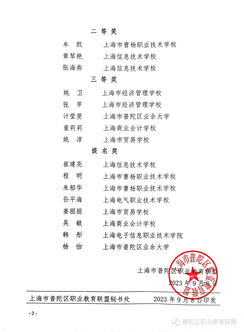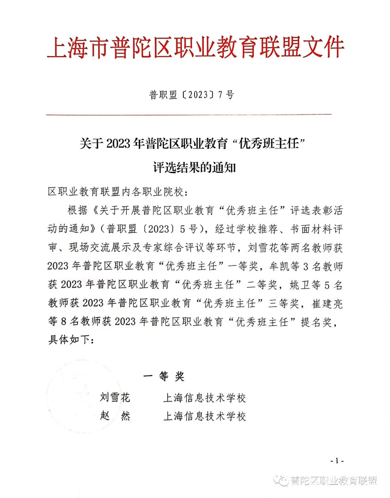 2023年9月9日,普陀区职业教育“优秀班主任”评选表彰活动落下帷幕,经学校推荐、书面材料评审、现场交流展示及专家综合评议等环节评比,我院韩彤老师获得教2023年区职业教育“优秀班主任”提名奖。