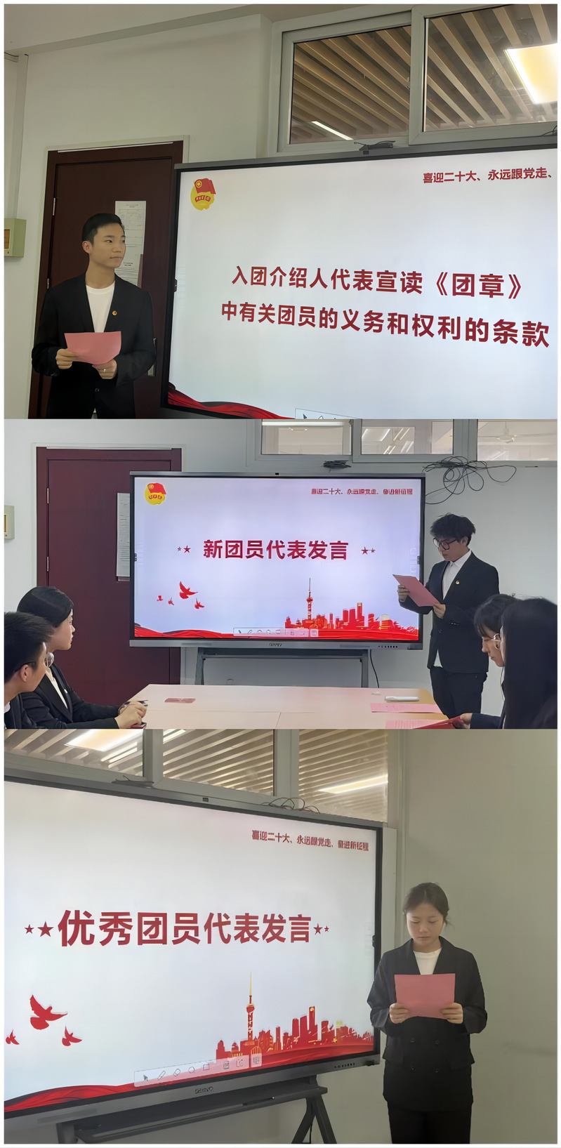 团总支副书记倪天诚同学宣读新团员名单,由团总支负责人严佳惠老师为新团员佩戴团徽,颁发团员证。宣誓环节由团总支副书记倪天诚同学领誓。新团员铿锵有力的宣誓中,涌现的是自己崇高的理想信念并为之奋斗的决心。