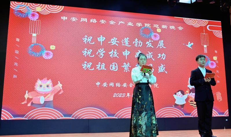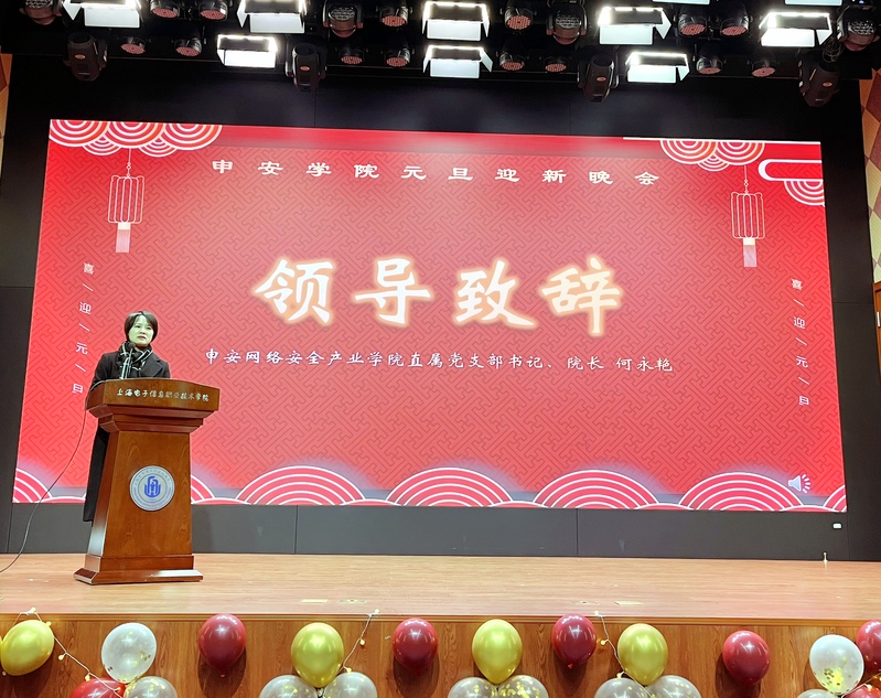岁末已至,新年将启。为进一步提升丰富申安网络安全产业学院学子的文化生活,进一步推进学院文艺活动蓬勃发展,给同学们一个展示自我风采的舞台,2023年12月27日晚,我院在普陀校区报告厅举办2023级元旦迎新晚会。随着暖场视频的播放,迎新晚会正式开始。申安网络安全产业学院直属党支部书记、院长何永艳,直属党支部副书记、副院长陈真及师生代表莅临现场,共赴视听盛宴。何永艳老师在晚会开始前致辞,并向同学们提出新一年的要求和希望。