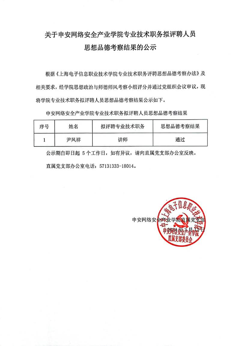 关于申安网络安全产业学院专业技术职务拟评聘人员 思想品德考察结果的公示