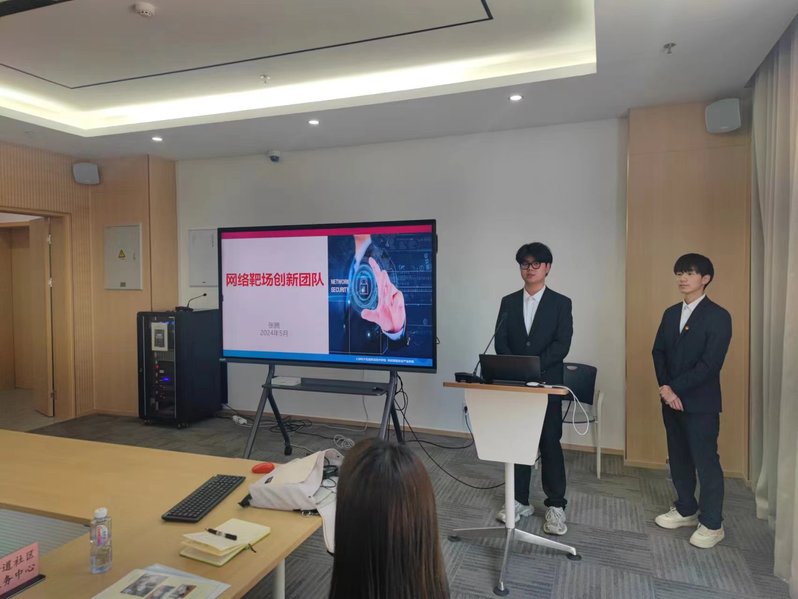 活动上,张腾和邓子祥两位同学从国家安全的概念和所涉领域入手,介绍了网络诈骗、电信诈骗的类型,以及防范诈骗的方法等,为来自上海长毅朗润文化体育中心、上海地铁第三运营有限公司7号线、上海市普陀区甘泉街道社区卫生服务中心、上海双通文化发展有限公司、上海富杉实业有限公司等来自7家企事业单位的代表做了一场题为“网络安全为人民,网络安全靠人民”的网络安全知识科普小讲堂,并就团队目前研发成果——虚拟网络靶场作为模拟真实网络环境的教学工具做展示介绍。