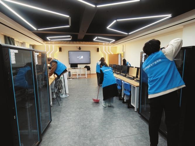 本次清扫活动在我校I楼机房进行,志愿者们按小组分工协作,迅速投入到清扫工作中。活动中,志愿者们认真清洁了机房内的每一台设备、桌面和地面,特别是电缆线、插座等较为隐蔽的地方。志愿者们通过使用清洁工具细致打扫,确保无一处疏漏,并对机房内的门窗、机柜等设备进行了检查,既确保了机房空气的清新,又保障了机房设备的整洁。