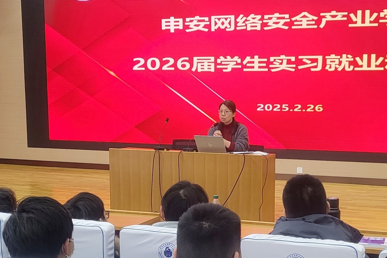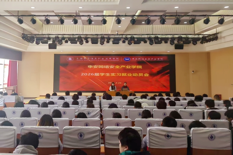 为稳步推进2026届毕业生实习就业工作,引导我院2026届学生树立正确的就业价值观,抢占就业先机,提前做好求职准备,2月26日中午,申安网络安全产业学院在C楼报告厅举办了“2026届学生实习就业动员会”。此次会议邀请学生处副处长梁咏梅老师主讲,学院直属党支部副书记、副院长陈真,就业负责人、教务负责人、教师代表及全体2026届学生280余人参会。