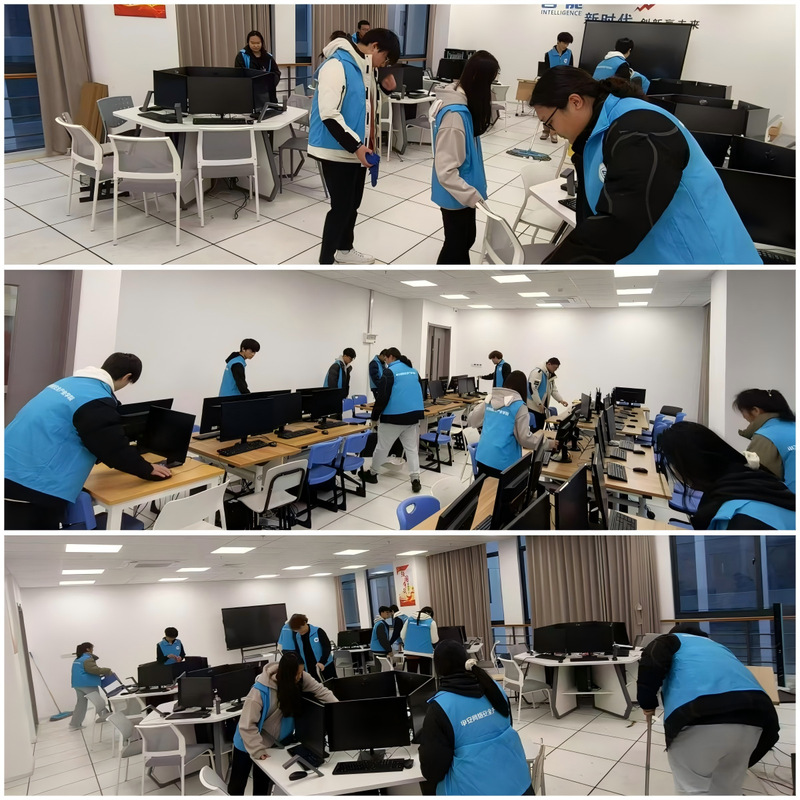 为营造良好的学习环境,给同学们提供更优质的实践体验,2025年3月12日,申安学院组织了“我为同学做实事” 之学习环境常治理服务活动。活动当日,志愿者们早早集合,携带清洁工具来到实训大楼,对申安学院以及其他学院的机房做整理和清洁。大家分工明确,擦拭电脑桌面、清扫地面以及对机房的桌椅进行了整理和归位。对电缆线、插座这些高危且容易被忽视的隐蔽区域,志愿者们更是细致入微,借助清洁工具,耐心地清理,消除潜在的安全隐患,给予同学们安全的学习环境。