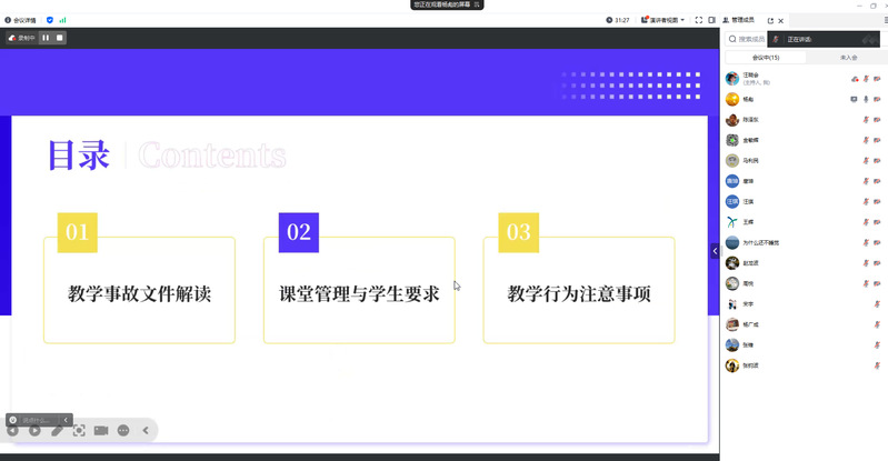 教学秘书汪晓会就质量监控体系进行细化说明。教学评价采取督导、领导同行以及学生多维评估模式。考勤考核方面要严格把关,特别关注异常出勤学生。