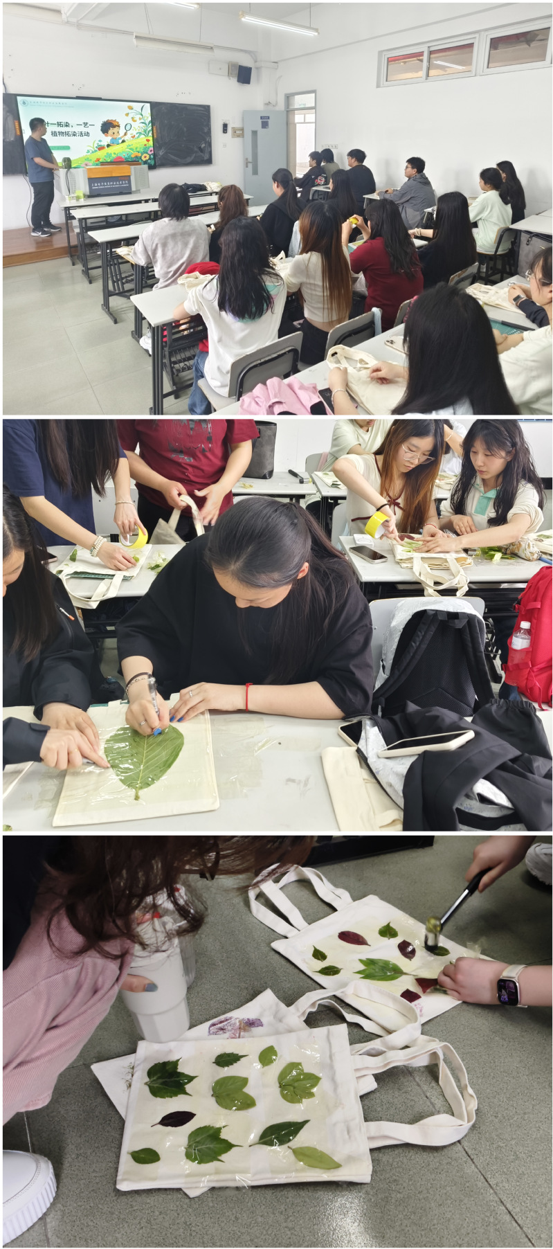 本次活动在同学们的欢声笑语中圆满落幕。一片片平凡的落叶经过匠心拓染,在帆布袋上绽放出永恒的生命力,不仅留下了大自然的诗意印记,更让非遗技艺在年轻一代手中焕发新生。此次活动以自然为课堂,以草木为教材,让同学们在敲拓之间深刻体会到传统工艺的智慧之美,在创作过程中领悟到人与自然和谐共生的真谛。未来,我院将继续搭建非遗文化传承的创新平台,让更多青年在感知美、创造美的过程中,成为中华优秀传统文化的守护者与传播者。