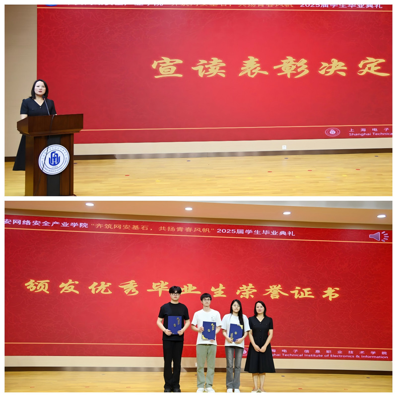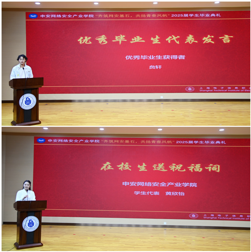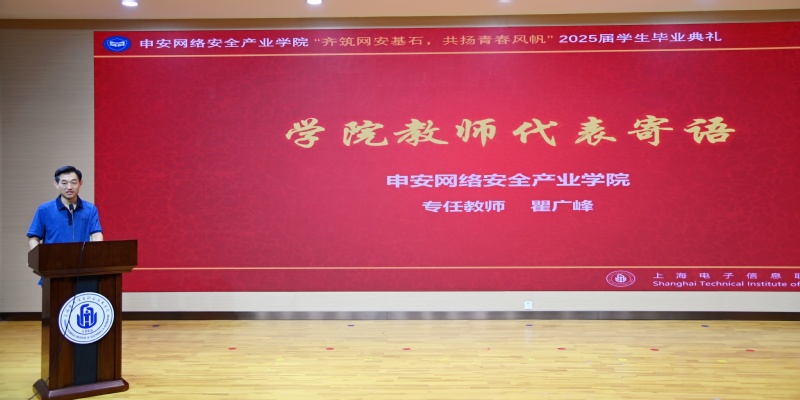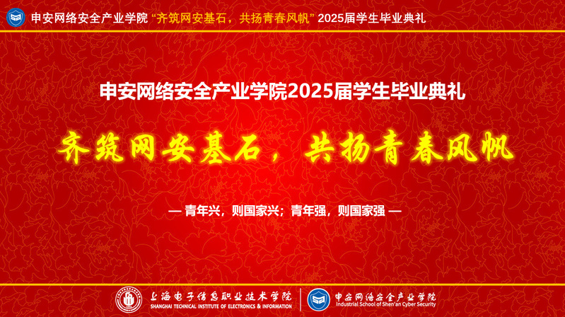 2025年6月26日,上海电子信息职业技术学院申安网络安全产业学院“齐筑网安基石,共扬青春风帆”2025届学生毕业典礼在C108报告厅隆重举行。学院直属党支部书记、院长何永艳,副书记、副院长陈真,副院长杨彪及教师代表出席典礼,与毕业生共同镌刻青春记忆,见证从校园到网络安全战场的使命传承。