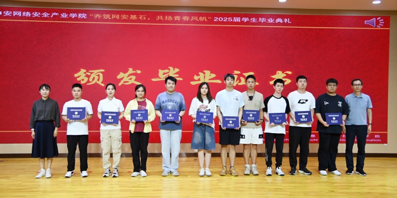 当陈真、杨彪老师为毕业生代表颁发毕业证书时,蓝色的毕业证书凝结着“为网络安全筑基石”的誓言。典礼在全体合影的快门声中落下帷幕,而属于2025届毕业生的网安征程才刚刚启帆。正如典礼结语所言:“你们键盘下的每一行代码,都在编织国家网络疆土的防护网;你们攻克的每一个漏洞,都在筑牢数据时代的安全防线。”