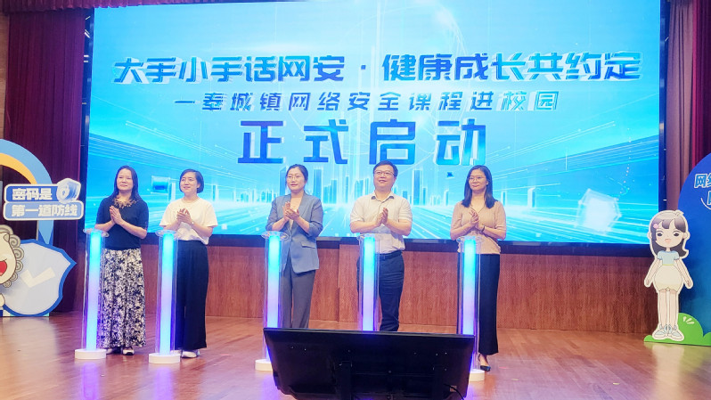 在“大手小手话网安·健康成长共约定——奉城镇网络安全课程进校园启动仪式”上,何永艳和区、镇领导共同点亮启动柱,为后续镇校在网络安全课程领域的深度合作奠定基础。