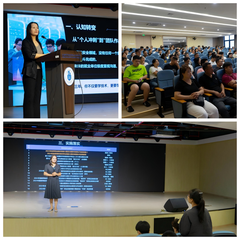会上,何永艳院长以《从高中到大学,锻造未来网安尖兵——你的三年卓越之路》为主题,围绕三大核心维度展开深度解读:她首先聚焦“学生认知转变”,引导新生从高中“个人冲刺”模式,逐步适应大学“团队协作”的学习与成长节奏,强调网络安全领域需协同作战的行业特性;随后介绍学院发展概况,让家长与新生全面了解学院育人理念和培养方式;最后详解人才培养落地举措,结合学院过往在全国及上海市网络安全类赛事中获得的奖项,激励新生投身专业学习,永攀竞技高峰。