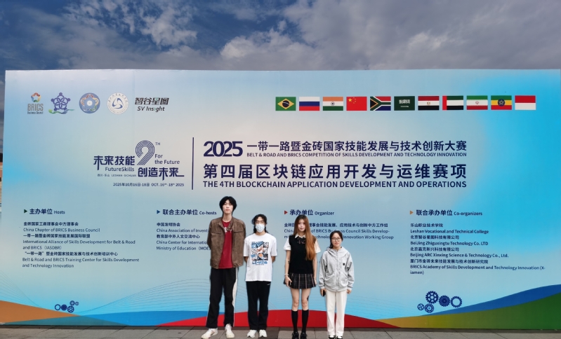 10月16日至18日,2025年“一带一路”暨金砖国家技能发展与技术创新大赛第四届区块链应用开发与运维赛项在乐山职业技术学院举办,全国154支队伍同台竞技。学院两支参赛队伍在唐坤、袁益民、周安石三位教师的指导下,深耕技术、全力以赴,最终连嘉浩与王心宇组成的一队勇夺一等奖,吴疏影与黄珊珊组成的二队斩获三等奖,学院凭借出色的组织协调获评优秀组织奖。